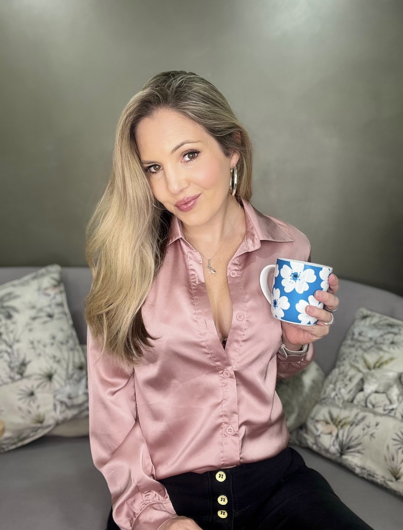 A woman with long blonde hair, wearing hoop earrings, a delicate necklace, and a white blouse with black hearts, posing for a photo against a plain, muted green background.
