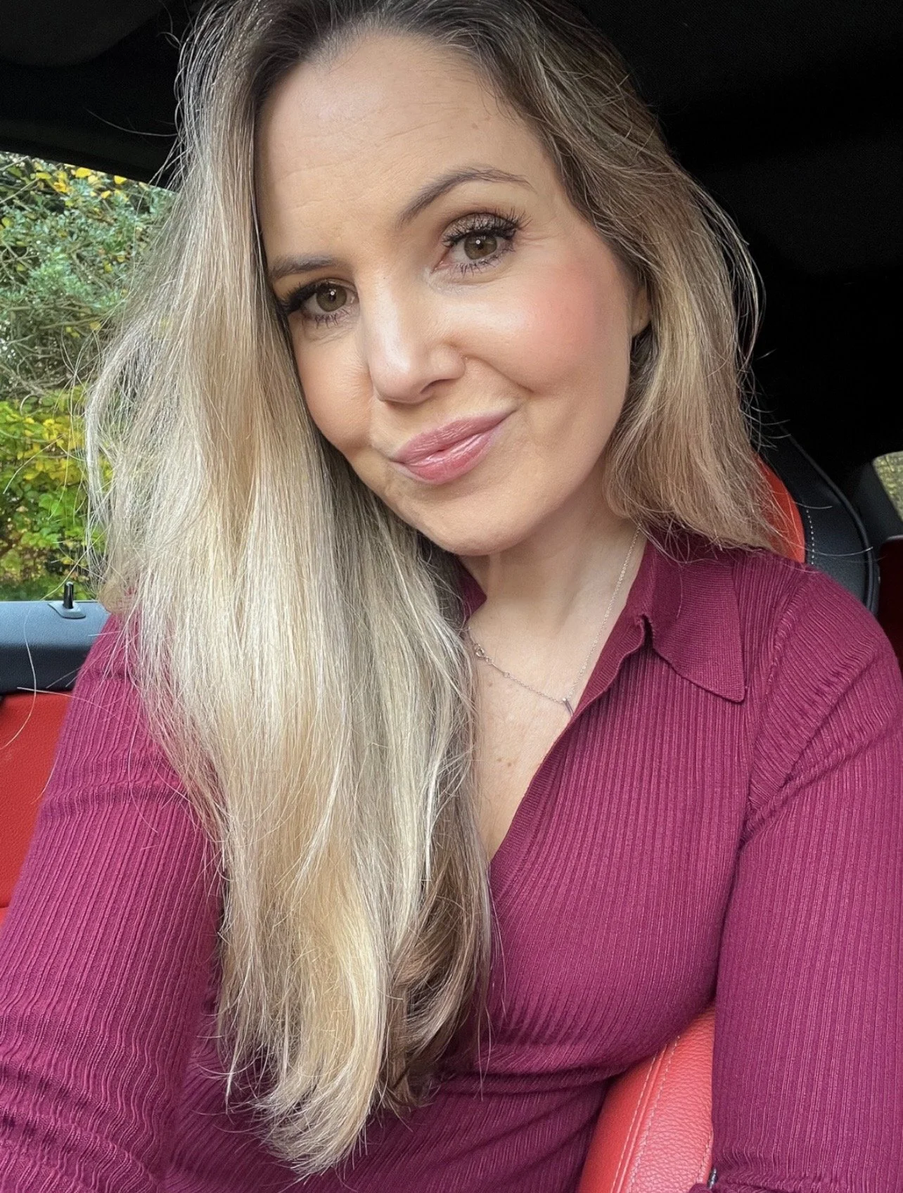 Close-up of a woman with long blonde hair, wearing a burgundy top, sitting in a car with greenery outside the window.